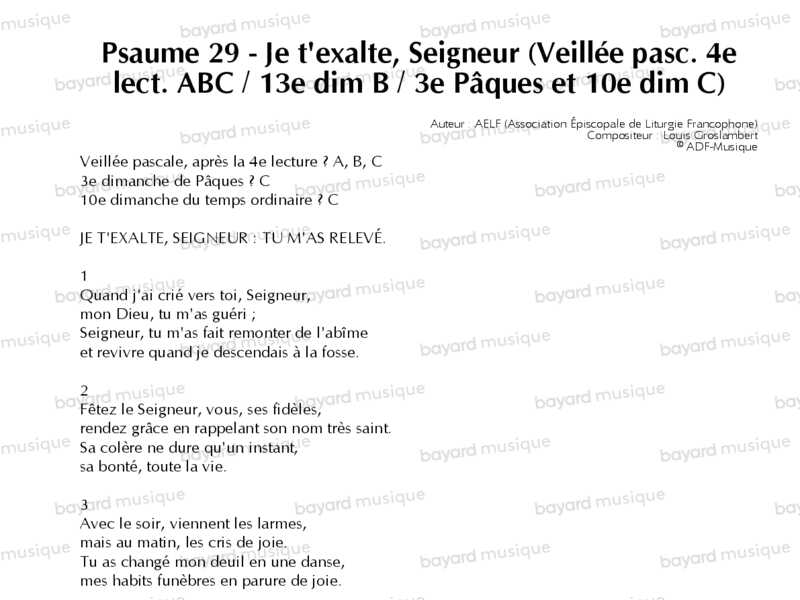 10. Psaume 29 - Je t'exalte Seigneur, tu m'as relevé (Veillée pascale, après la 4e lecture, années A, B et C)