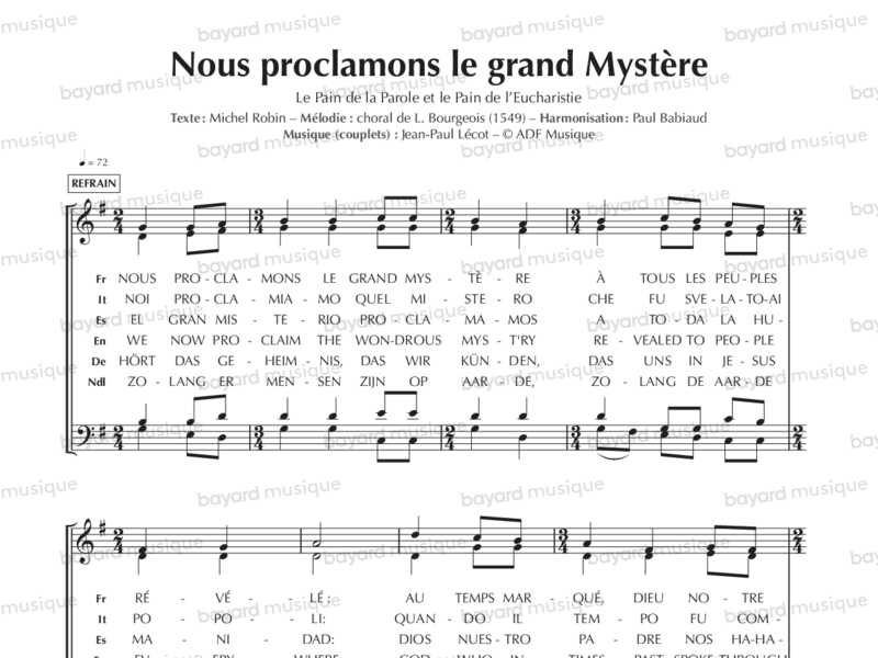 Partition en français, italien, espagnol, anglais, allemand et néerlandais, avec accompagnement d'orgue.