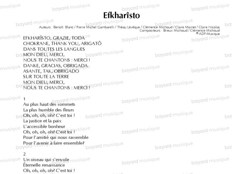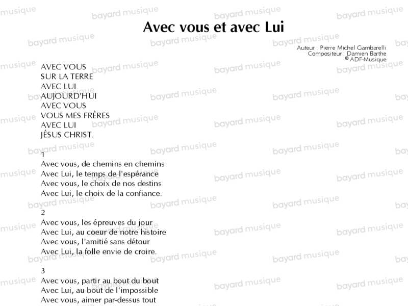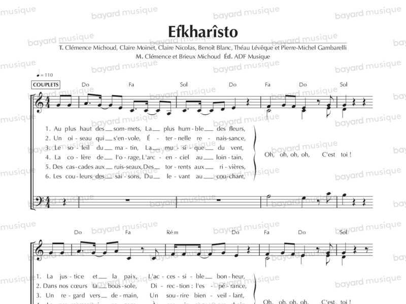 Comprend les partitions à 4 voix mixtes, 3 voix mixtes, 3 voix égales de femmes, et les additionnels instruments (violon, flûte, guitare) de l'album "Chemins de fraternité"