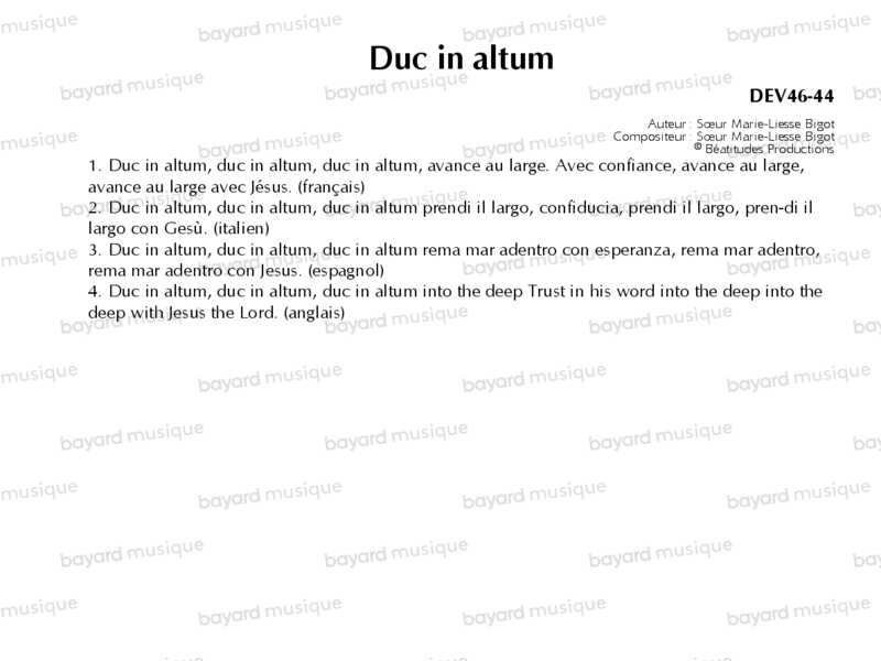 Chants et Prière. Onze chants inspirés tels que "Céleste Jérusalem", "Totus Tuus", "Duc in altum", "N’ayez pas peur"... Chaque chant est suivi par deux courtes citations de saints.