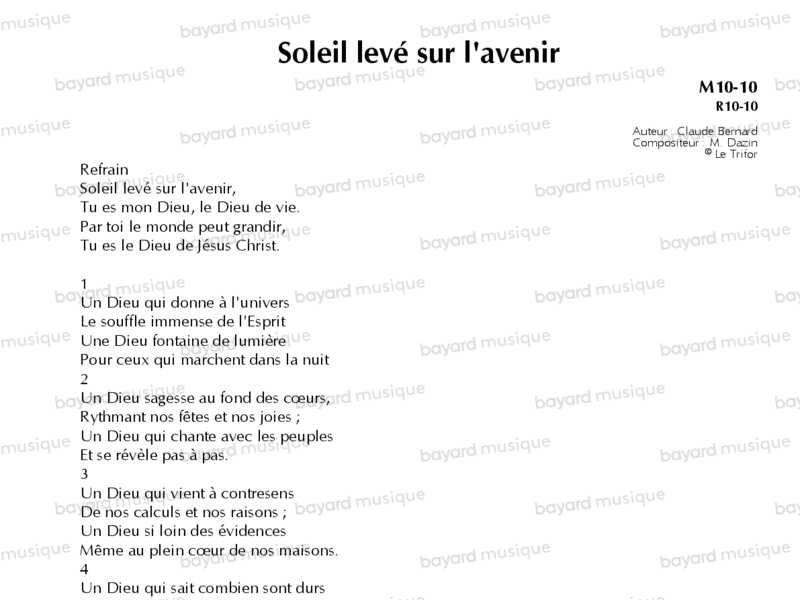 Notre Dieu a un visage unique, avec de multiples facettes. On ne peut le définir ni l\'enfermer et il s\'échappe à toute définition. Tout l\'évangile est contenu dans ce texte qui bouscule les certitudes. Ce chant conviendra bien à des rassemblements exceptionnels et lors de célébrations d\'engagements dans l\'Eglise : Profession de Foi, Confirmation.