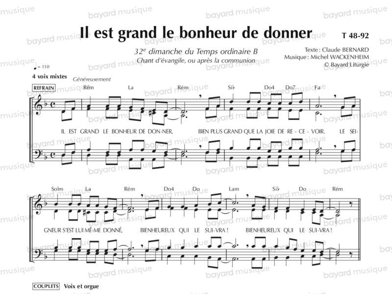 Ce chant s'inspire à la fois de Marc 12 et d'une réflexion de saint Paul dans le livre des Actes des Apôtres. Ce chant peut-être utiliser dans la catéchèse ou la liturgie, sur le thème de"donner", sur le sens à donner à sa vie; chant d'action de grâce pour le dimanche des Mission, de solidarité...