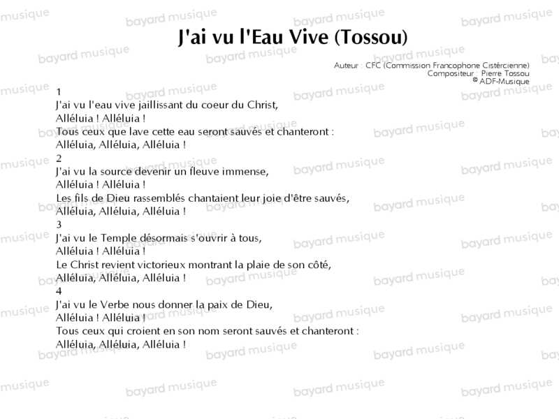 Ezékiel avait eu la vision d'une source abondante jaillissant du Temple devenant un fleuve immense et apportant la vie en abondance sur son passage. Pour l'évangile de Jean, Jésus accomplit cette prophétie : il est le Temple nouveau (Jean 2, 21) qui laisse s'écouler de son côté (Jn 19, 34) "une eau jaillissant pour la vie éternelle" (Jn 4, 14). Un chant qui évoque l'action de chanter: c'est la joie contagieuse de Pâques qui s'exprime.C'est un chant pour la veillée pascale et le temps pascal (rite d'aspersion) ou pour le rite du baptême lui-même.