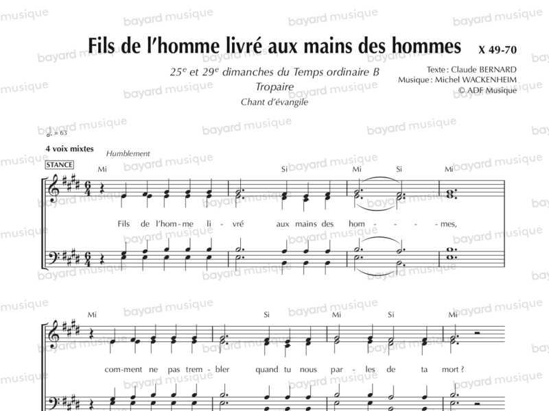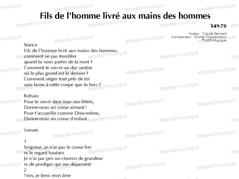 Ce chant a la forme d\'un tropaire. La stance reprend l\'expression évangélique \"Fils de l\'homme livré aux mains des hommes\". Les versets rappellent la véritable grandeur de Jésus, dans son rôle de Serviteur.Ce chant peu être utilisé en catéchèse, en catéchuménat, en retraite de profession de foi...