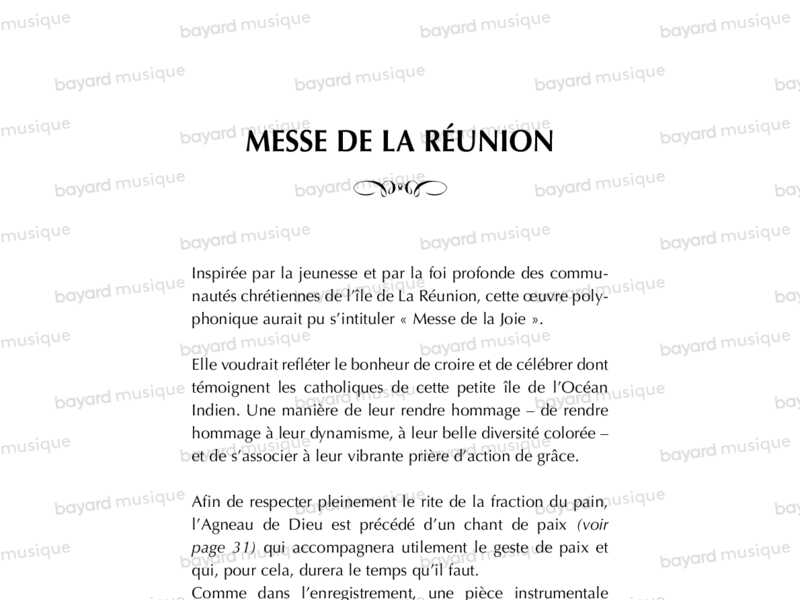 Livret de partition complet de la Messe de la Réunion, inspirée par la jeunesse et par la foi profonde des communautés chrétiennes de l\'île de La Réunion. / Parties instrumentales inclues.
