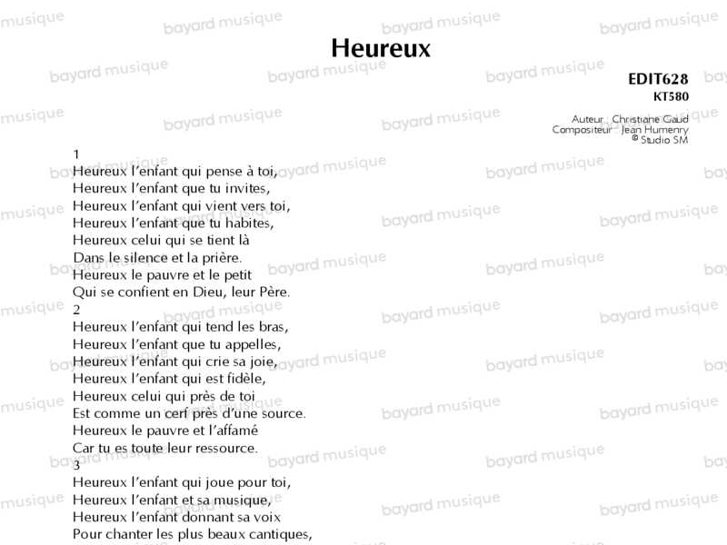 Ce chant reprend l\'appel au bonheur lancé par Jésus de la part de Dieu ! C\'est une prière de style méditatif, invitant au recueillement, à l\'abandon à Dieu.