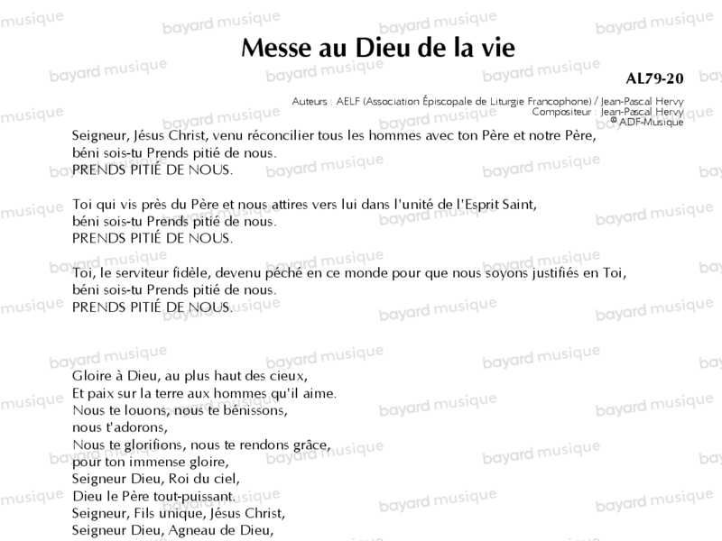 La partition comprend : Seigneur, prends pitié - Gloire à Dieu - Alléluia - Saint, le Seigneur - Anamnèse - Notre Père - Agneau de Dieu