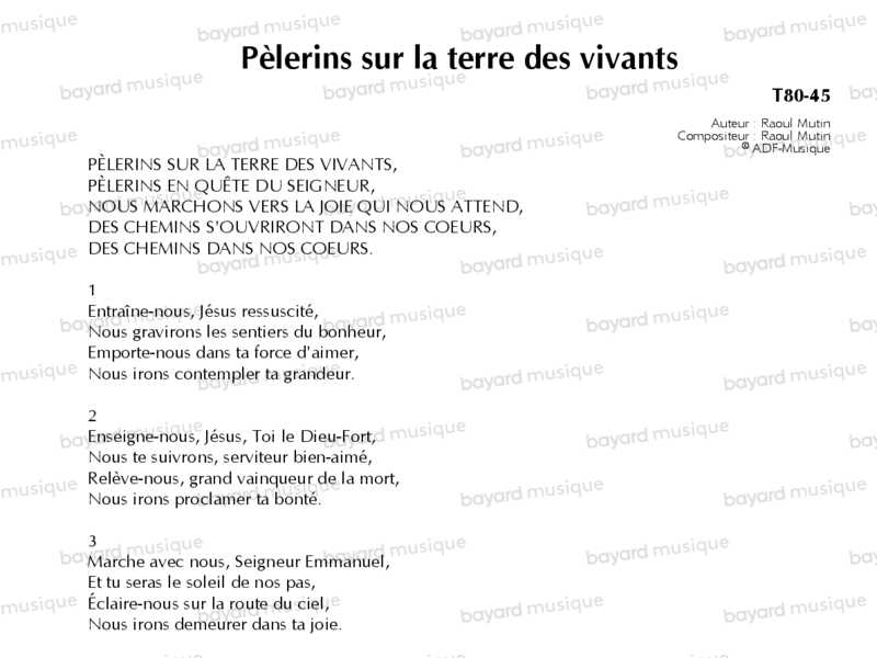 C’est le dernier verset du psaume 114 (116 A) qui a inspiré ce chant : « Je marcherai en présence du Seigneur sur la terre des vivants » (v.9). Le refrain du chant fait référence à un autre verset de psaume, le verset 6 du psaume 83 (84), mis en valeur lors de la démarche synodale : « Heureux les hommes dont tu es la force : des chemins s’ouvrent dans leur coeur ! » ; dans le chant, le verbe est mis au futur : « des chemins s’ouvriront ». Le texte nous invite à ne pas oublier le but vers lequel nous marchons. Le Document de la Commission Théologique Internationale sur la synodalité nous rappelle « le caractère “pèlerin” de l’Église » (§ 49) . L’Église est « le peuple du chemin vers le royaume céleste » (§ 50). Comme le dit le refrain du chant : « Nous marchons vers la joie qui nous attend », et, dans le dernier couplet, nous demandons au Christ de nous éclairer « sur la route du ciel ».