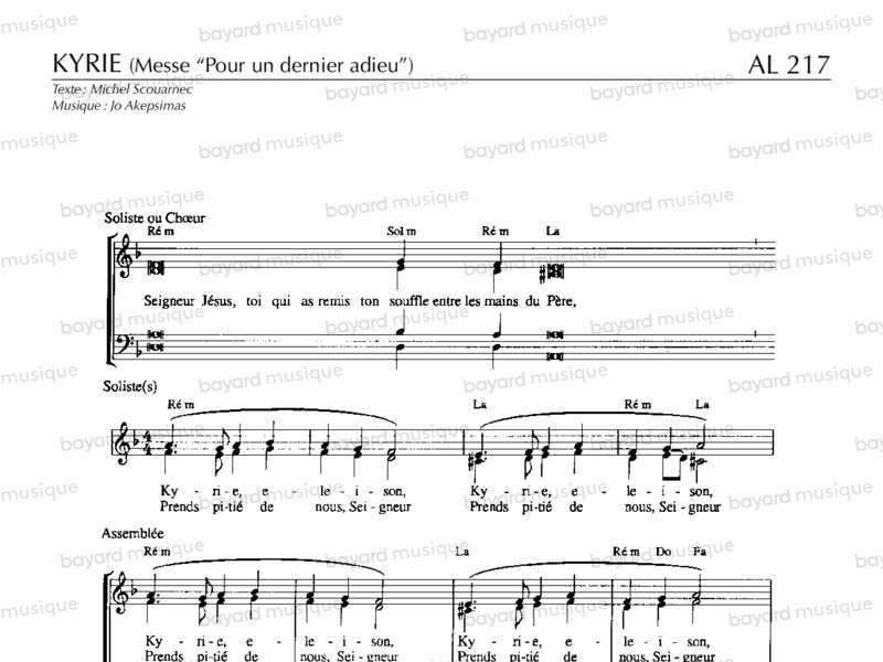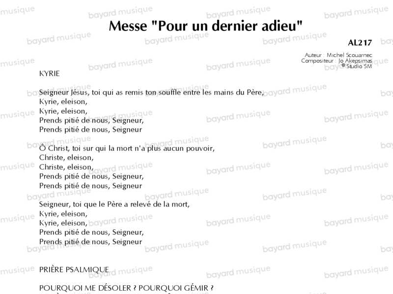 La partition comprend les chants de la messe "Pour un dernier adieu" : Kyrie - Prière psalmique - Prière universelle - Saint le Seigneur, Dieu des vivants - Agneau de Dieu livré pour nous