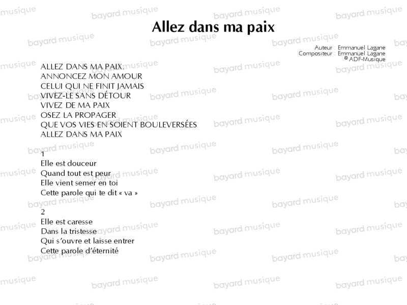 Chant d’envoi pour terminer la célébration en reprenant les paroles de la liturgie et des évangiles. (Voir Matthieu, chapitre 28 et Jean, chapitre 20.) C’est le Christ qui parle et choisit les mariés, leurs témoins et leurs proches pour les envoyer porter au monde son message de paix et d’amour.