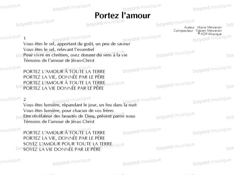 Chant d’envoi, pour terminer la célébration en reprenant avec joie un commandement de Jésus : celui d’être sel de la terre et lumière du monde (d’après l’Évangile de saint Matthieu, chapitre 5). Les mariés sont envoyés par l’assemblée comme témoins de la vie et de l’amour qu’ils reçoivent de Dieu.