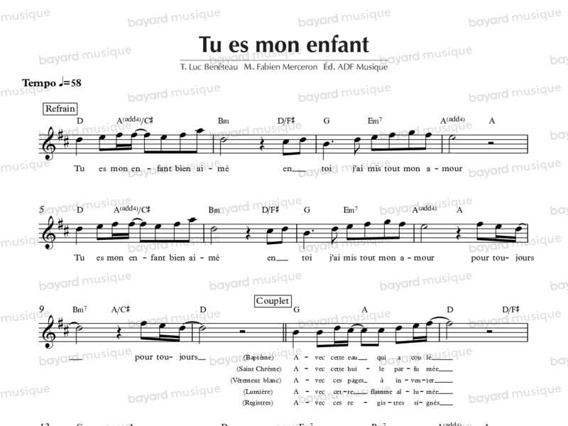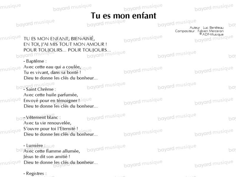 Chant pour accompagner chaque geste ou symbole du baptême. Ils sont ainsi expliqués en musique et la suite des gestes rituels devient plus claire pour l’assemblée. Le refrain reprend une parole de Dieu le Père à son Fils Jésus (évangile selon saint Matthieu, chapitre 3), destinée à chacun de nous.