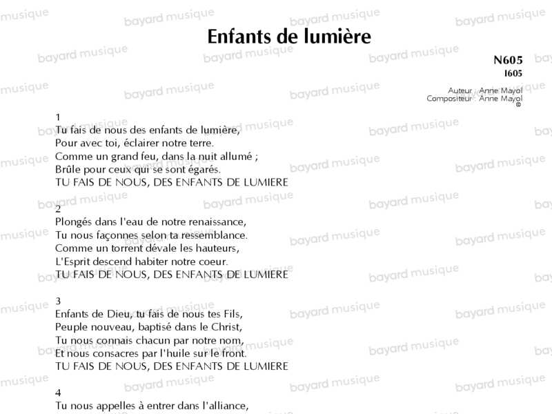 Le texte du refrain est directement en lien avec le rite de la lumière au baptême. Les couplets soulignent d\'autres aspects du baptême : l\'eau, le nom, l\'onction d\'huile, tout en appelant à vivre en baptisés dans le monde d\'aujourd\'hui et à témoigner de notre foi. Un chant qui conviendra bien pour la fin d\'un baptême ou pour une confirmation