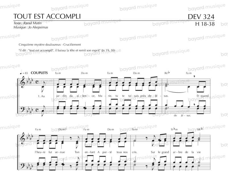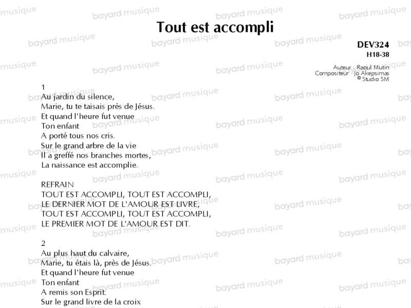 En Jésus, comme le dit le refrain du chant, \"le dernier mot de l\'Amour est livré\", mais ce dernier mot, dans le mystère de la mort-résurrection, est aussi un commencement: le grain de blé jeté en terre portera du fruit: \"le premier mot de l\'Amour est dit\".Saint Jean nous dit que Marie \"se tenait debout près de la croix\", Stabat mater\" (jn 19, 25). Le deuxième couplet exprime l\'accomplissement des Écritures. Saint Jean l\'explicite à la fin du récit de la passion: \"Tout cela est arrivé pour que s\'accomplissent l\'Écriture\" (Jn 19, 36). Le troisième couplet évoque l\'accomplissement de la promesse: \"Dieu l\'a pleinement accomplie à l\'égard de nous, ..., quand il a ressucité Jésus\" Ac 13, 33). Le mystère pascal est mystère de mort-résurrection. Au matin l\'Église, Marie est là, en prière, avec les Apôtres (Ac 1, 14). Le navire de l\'Église est en marche: \"sur le grand mât de l\'avenir\" se dresse l\'espérance des hommes. Chant pour une méditation sur la passion ou un chemin de la croix.